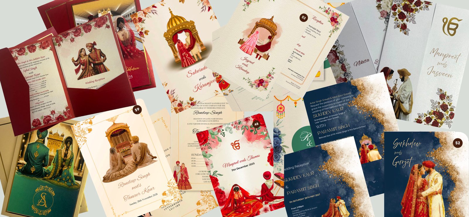 1) Muslim Wedding Cards 2) Sikh Wedding Cards 3) Hindu Wedding Cards 4) Asian Wedding Cards 5) Laser Cut Wedding Cards 6) Floral Invitations 7) £0.40 Flat Invitations 8) Pakistani Wedding Cards 9) Indian Wedding Cards